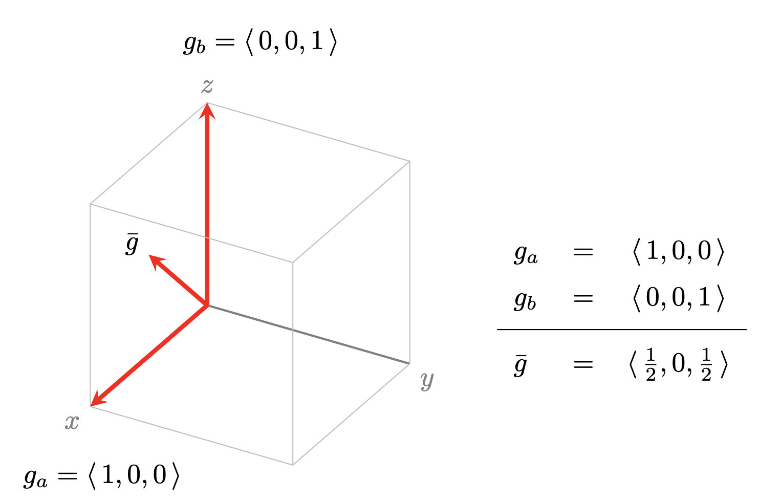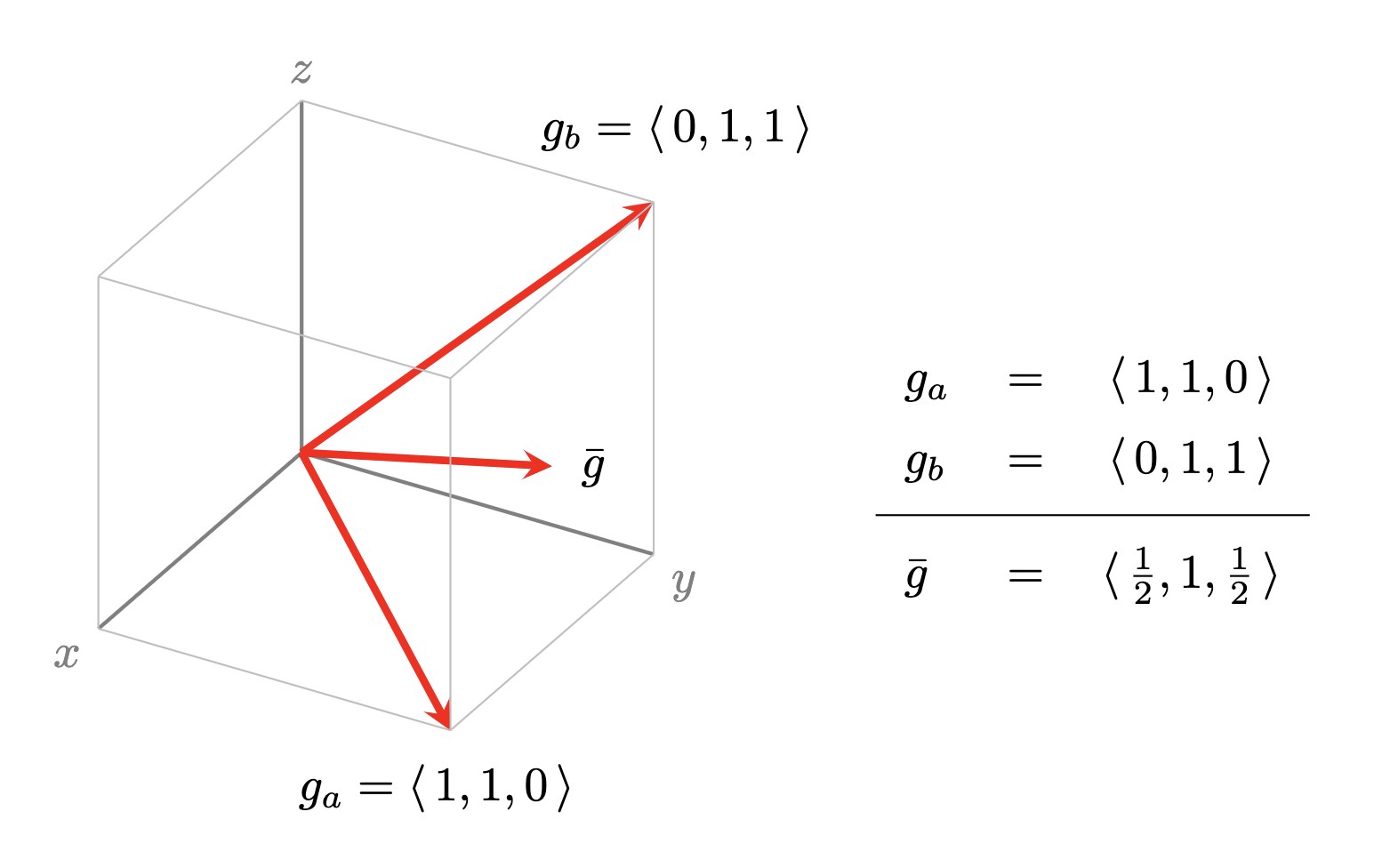 Figure 1. Example showing two training examples $a$ and $b$ whose gradients have a direction in common. Note that the descent step due to the average gradient $\bar{g}$ is stronger in the common direction $y$ (that reduces loss on both $a$ and $b$) than in the idiosyncratic directions $x$ and $z$ (which only reduce loss on one example).