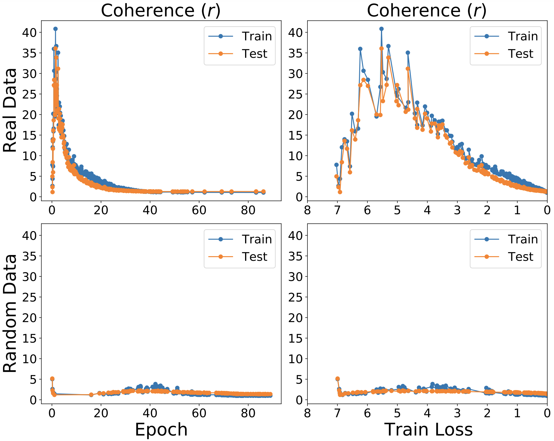 Figure 3. Coherence during training on 50,000 training and test images for a ResNet50 model on real and random ImageNet (top and bottom rows, respectively) as a function of training epoch and training loss (left and right columns). Real ImageNet shows much higher coherence than random with each example helping dozens of other examples in the sample for much of the training. In contrast, each random example helps less than a handful of other examples.