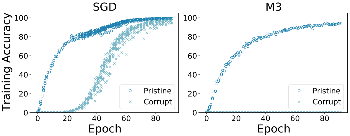 Figure 4. By taking a descent step down the (component-wise) median-of-3 mini-batches (M3) instead of their average as done in Stochastic GD (SGD), the generalization gap can be greatly reduced. For a ResNet50 trained on a dataset where 50% of the images have corrupt labels, SGD learns both pristine and corrupted labels (left) whereas M3 only learns the pristine labels (right).